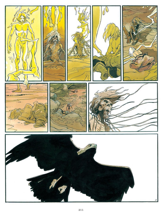 Bess, who would later collaborate with writer Jorodowsky on Son of the Gun, brings to life the writer’s words brilliantly here with a style that’s seemingly unique to many a European illustrators from the 1970s, 1980s and 1990s. In the same vein as the famous Moebius and other Europeans, Bess beautifully uses a variety of panel sizes and shapes in order to best capture the story as it unfolds, frame-by-frame. Maybe most impressive is Bess’ use of color, which contains many a shades of yellow, red, browns as well as the use of negative space in white, highlighting specific characters and actions throughout.