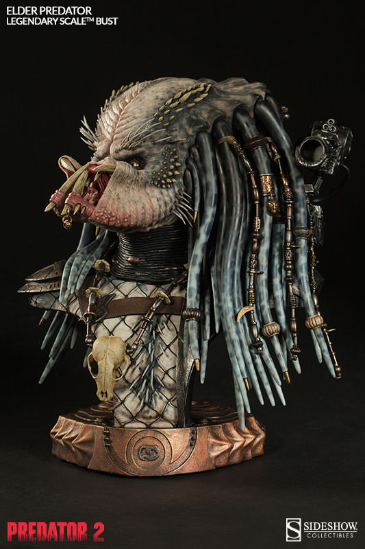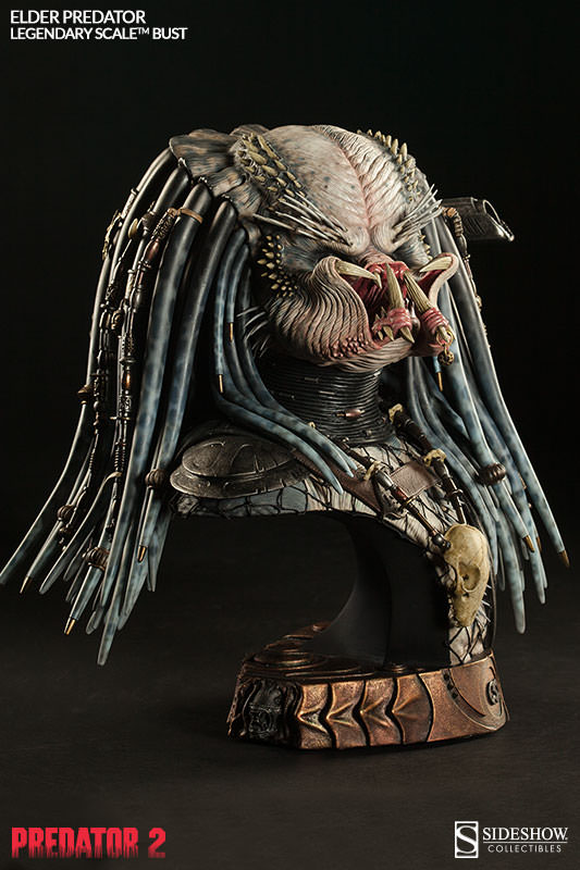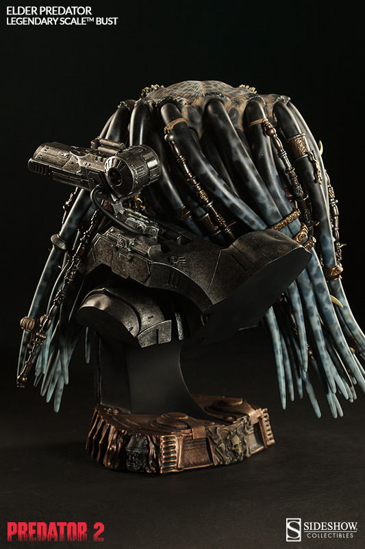 Sideshow presents the newest Predator to join their Legendary Scale Bust collection: the Elder Predator. This fan-favorite Yautja is sculpted as it appeared in Predator 2 with intricate tribal jewelry and shoulder-mounted plasma cannon. As with most all Sideshow Legendary Scale Busts, the exclusive edition will include an accompanying ‘Predator 2’ film nameplate (pictured below).