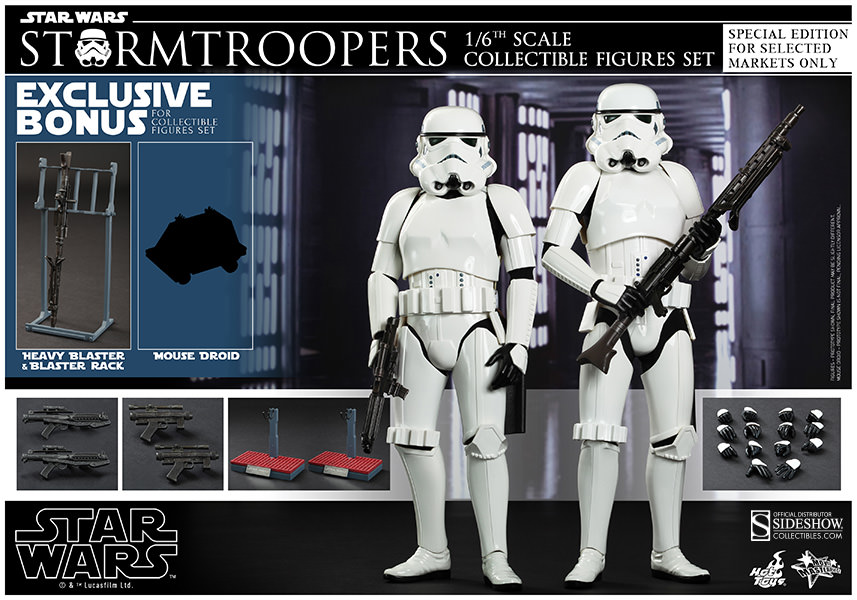 Sideshow has opened pre-orders on Hot Toys' newest 1:6th scale Star Wars release: the Stormtrooper. The individual Stormtrooper can be ordered HERE priced at $199.99 or collectors can invest in a Stormtrooper 2-pack HERE priced at $399.99. The set includes several bonus incentives: a Heavy Blaster and Mouse Droid, as well as a previously unannounced item - an additional Blaster Rack.