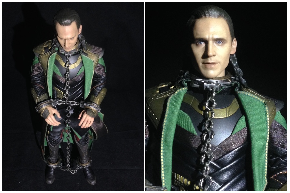 In comparison to the Avengers Loki, this updated version features a lot less accessories considering the enormous box it comes housed within. It would have been great if Hot Toys would have taken advantage of this and included an additional wardrobe for Loki from the scene where he was imprisoned on Asgard. However, the figure does include full-body unified shackles which is really awesome packed-in item which enhances the value of this figure. The shackles are beautifully sculpted and feature intricate movie-accurate details and real metal chains that hold each restraint together. The shackles and neck restraints can be easily placed on the figure by removing the head, hands and ankles and sliding the corresponding restraints around the body parts.