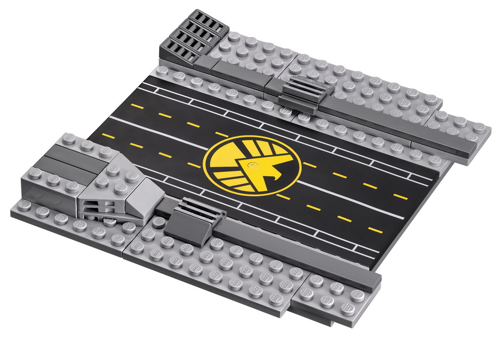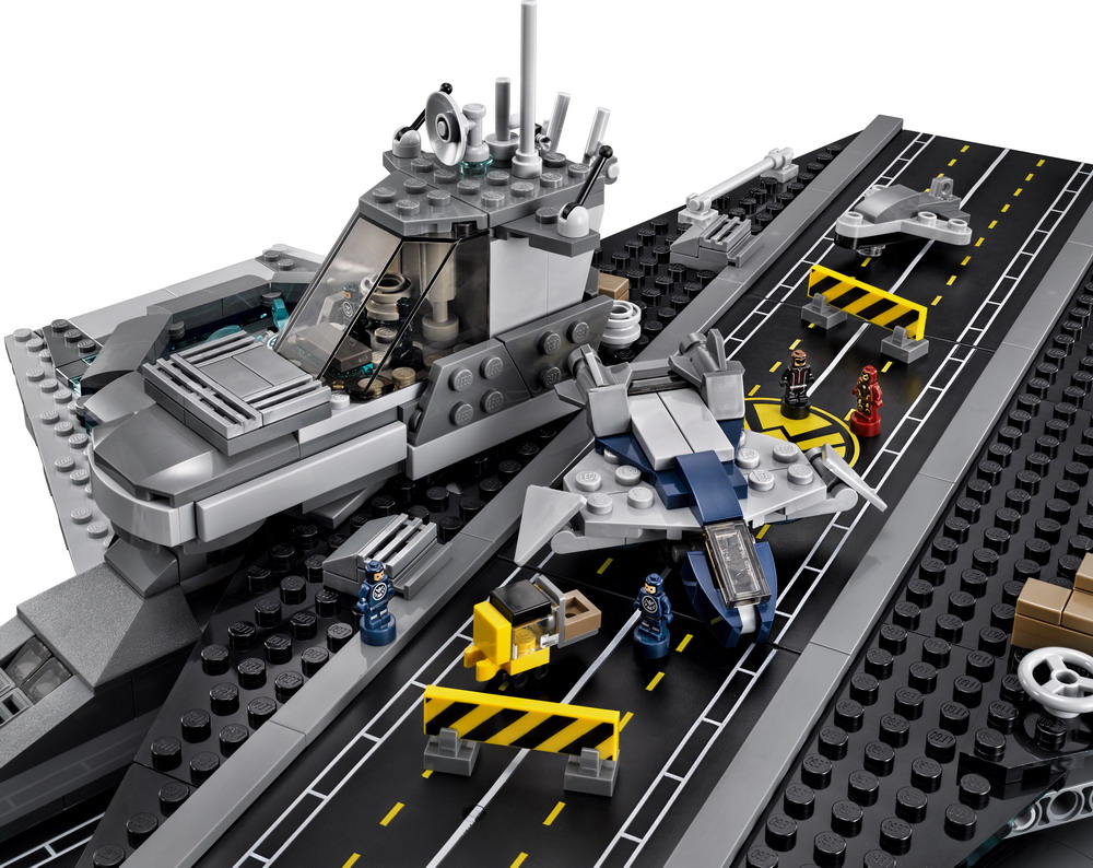 • Features 3 microscale Quinjets, 3 fighter jets, a gasoline truck, 2 forklift trucks, 2 runways, 4 road blockades, armored exterior with translucent elements, detailed interior, plus 12 microfigures (Nick Fury, Hawkeye, Captain America, Iron Man and 8 SHIELD agents)