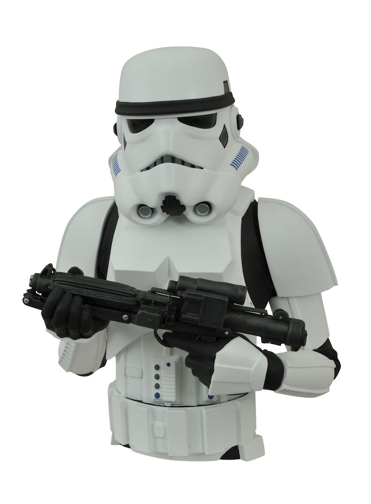 The legendary Imperial Stormtrooper has joined DST’s line of vinyl Star Wars bust banks! Measuring 8 inches tall, this vinyl, waist-up bank depicts of one of the iconic soldiers of the original Star Wars trilogy, blaster at the ready. Not only does it feature the detailed painting and sculpting of a collectible bust, it also has a coin slot and an access door in the base, making it a fully functioning coin bank. He’ll keep your money safer than Cell Block 1138! Packaged in a clear polybag. (Item #FEB152160, SRP: $22.99)