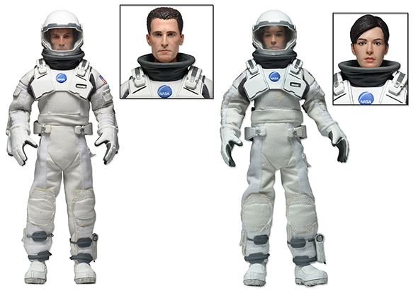 NECA's popular Mego-Style 8" Clothed Action Figure line was on display at Toy Fair, showcasing a number of new figures including a set based on the film Interstellar. This limited edition box set includes retro-style Brand and Cooper wearing fabric clothing similar to the iconic toy lines of the 1970s, and feature the likenesses of actors Matthew McConaughey and Anne Hathaway. Each figure will feature interchangeable helmeted and unhelmeted heads and their NASA spacesuits are tailored cloth with sculpted and fabricated backpacks, boots, gloves and helmets. Look for the Interstellar figure set in stores this May/June.