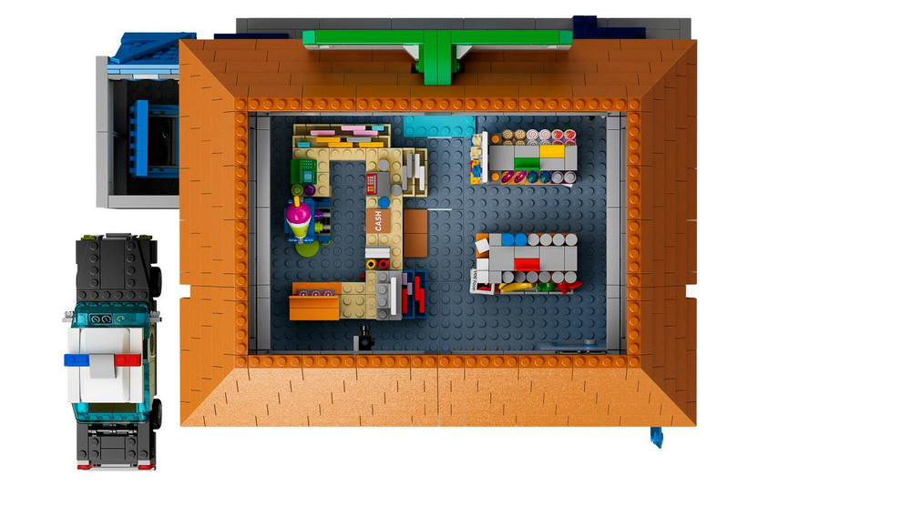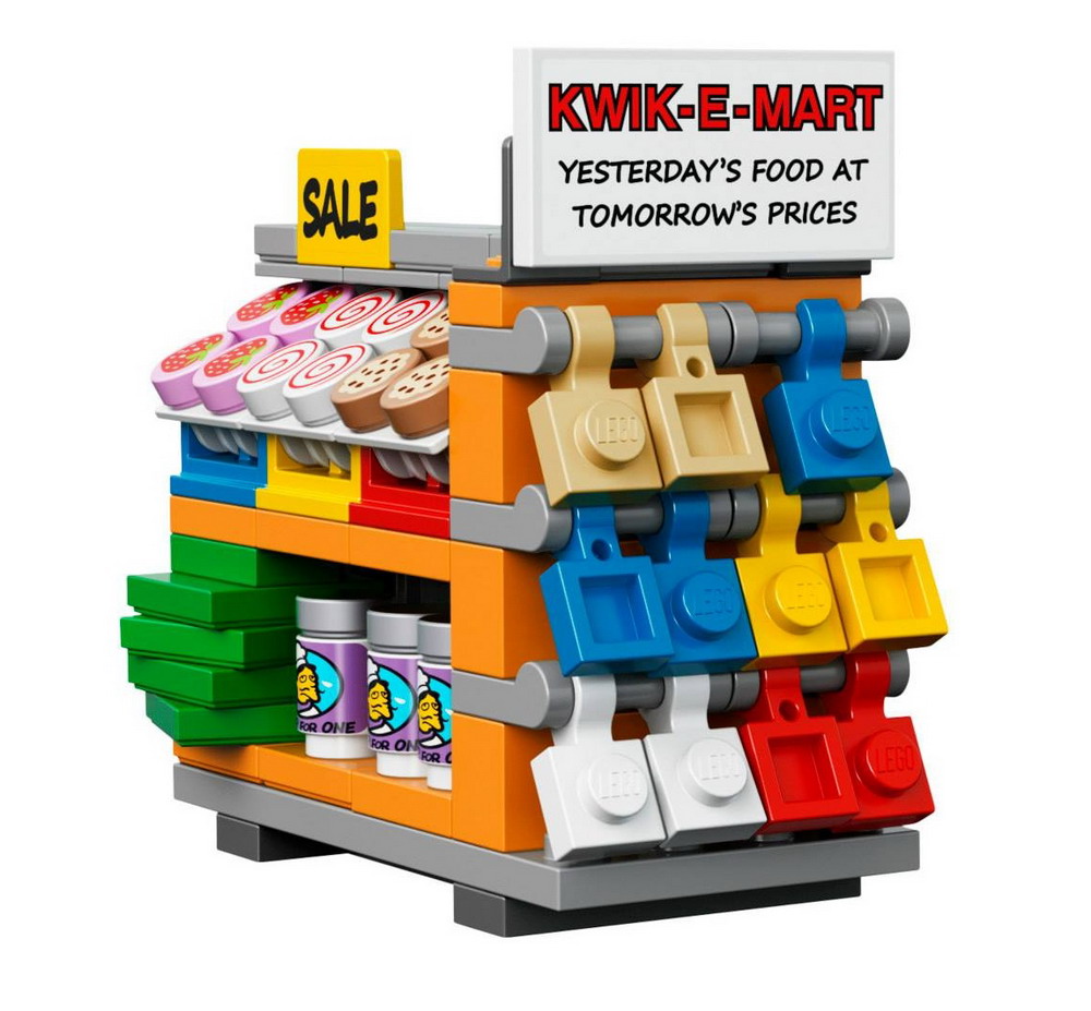 LEGO is expanding its popular series based on The Simpsons with a new playset: the Kwik-E-Mart. The 2179 piece set includes an opening replica of the animated convenience store, complete with Squishee machine and sales rack ("Yesterday's Food at Tomorrow's Prices"), a dumpster, and a Springfield police car. Exclusive figures to the set include Apu, Bart, Homer, Marge, Chief Wiggum, and Snake Jailbird. Look for it this May priced at $199.99 US.