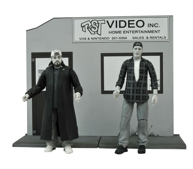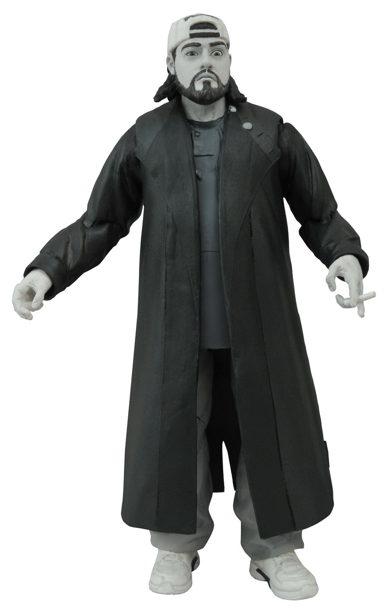 A Diamond Select Toys release! We assure you – this toy line is open! DST continues their line of action figures based on Kevin Smith’s classic film Clerks with RST Video employee Randal Graves and subvocal spectator Silent Bob! Each 7-inch scale action figure is captured in the film’s famous black-and-white palette, and includes film-accurate accessories, as well as a diorama base that can be used to re-create the exterior and interior of RST Video. Complete the shopping center diorama started by Dante and Jay! Sculpted by Patrick Piggott, and packaged in Select-style display packaging, with spine artwork. (Item #APR152301, SRP $149.94/case), Randal B&W Figure            (Item #APR152299, SRP: $24.99, Silent Bob B&W Figure (Item #APR152300, SRP: $24.99)