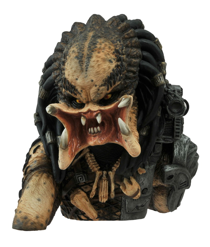 DST goes deeper into the jungle with this vinyl bust bank of an unmasked Predator! With his mandibles out and his shoulder cannon at the ready, this hunter is protective of his prize, and his prize is your loose change! Insert coins through a slot in the back and remove them through an access door in the base. With a detailed, collectible-quality sculpt by Eli Livingston, you’ll take one look at this bank and you’ll say, “You are one ugly money-saver!” Packaged in a clear polybag. (Item #APR152309, SRP: $22.99)