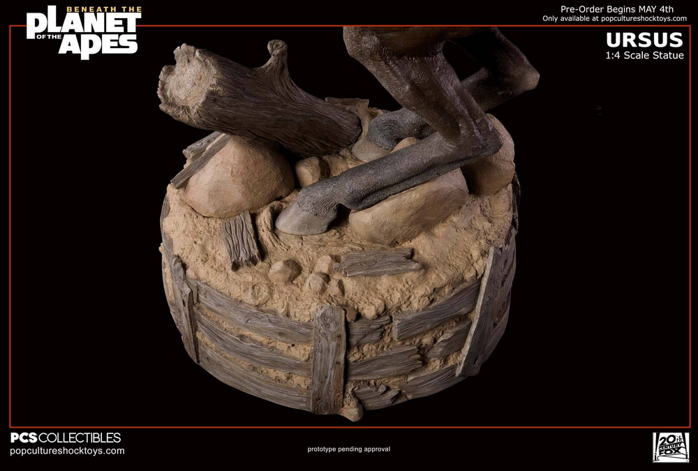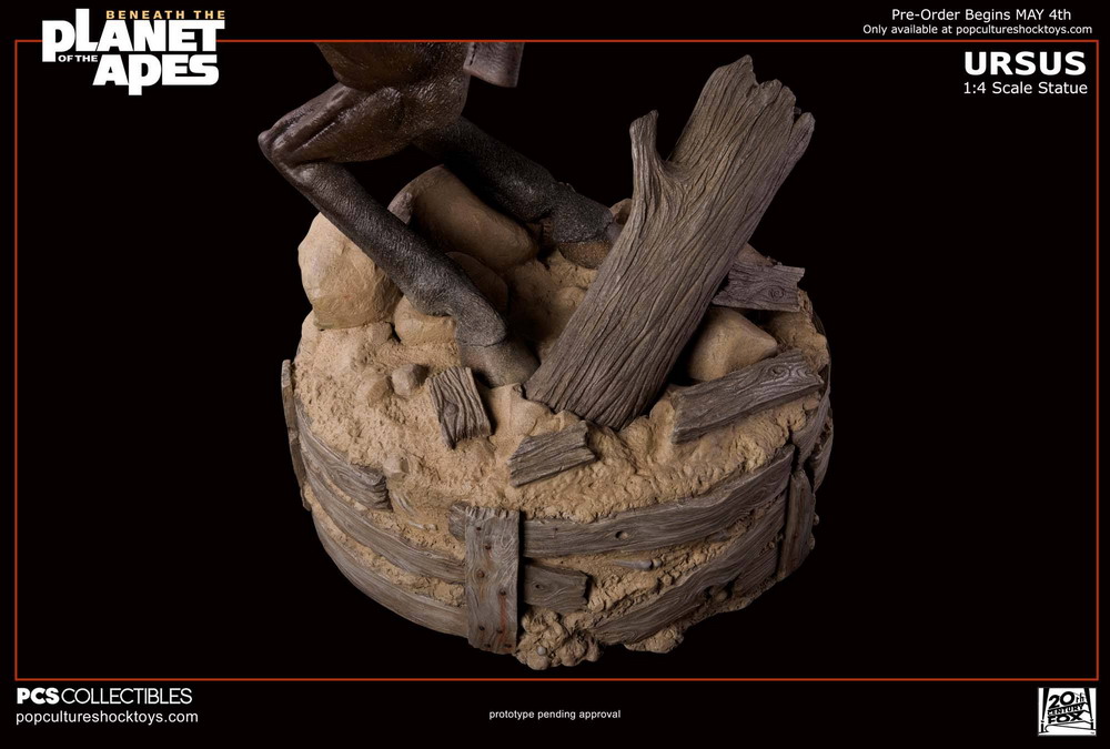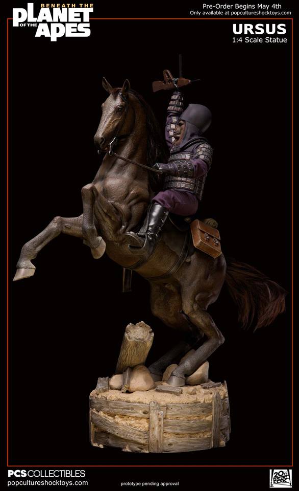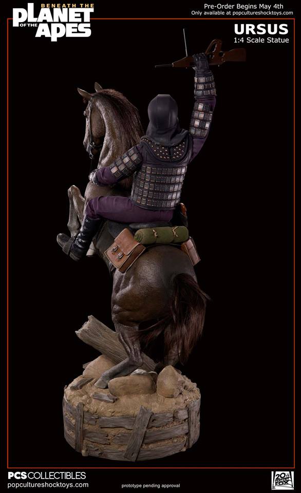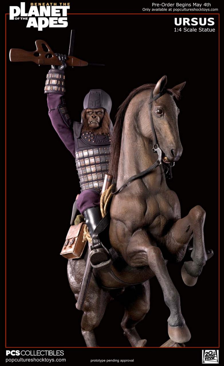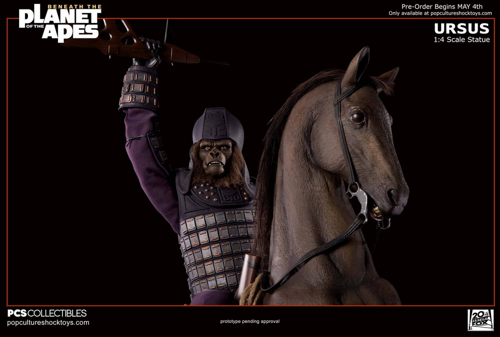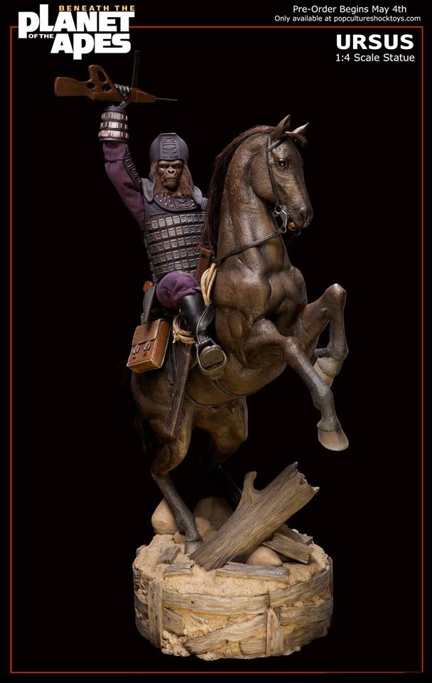 Pop Culture Shock has released new photos of their latest classic Apes statue: General Ursus as seen in Beneath the Planet of the Apes. This towering 1:4th scale statue measures 31 inches tall and depicts the gorilla soldier riding into battle on horseback. Only available through popcultureshocktoys.com, the statue will be priced at $949.99 and limited to only 350 pieces. Pre-orders begin on Monday, May 4th at 3pm Pacific Time.