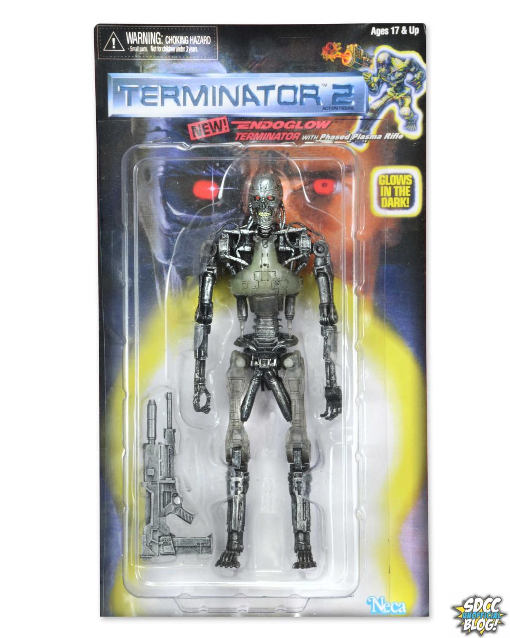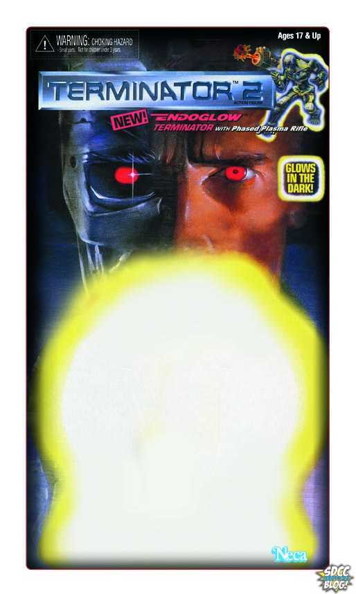 The San Diego Comic-Con Unofficial Blog has just revealed ‎NECA's latest SDCC '15‬ exclusive: a ‪Terminator 2 Retro ‪‎Endoglow‬ ‪‎Endoskeleton‬ action figure. The 7 inch figure and its blister card packaging is a tribute to Kenner's classic Terminator 2 toy line produced in the '90s. The figure will feature modern scultping and articulation, plasma rifle accessory, and of course it also glows in the dark.
