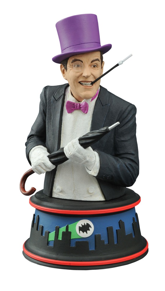 Batman’s rogues gallery continues to grow as the Penguin joins the Riddler and the Joker in DST’s line of busts based on the Batman Classic TV Series! This 6-inch-tall resin bust captures Burgess Meredith as fowl fiend, wielding a deadly umbrella and an equally deadly sneer. Bust sits atop a colorful base inspired by the show’s animated opening credits, and comes packaged in a full-color box. Designed by Barry Bradfield! Sculpted by Jean St. Jean! (Item #DEC142214, SRP: $59.99)