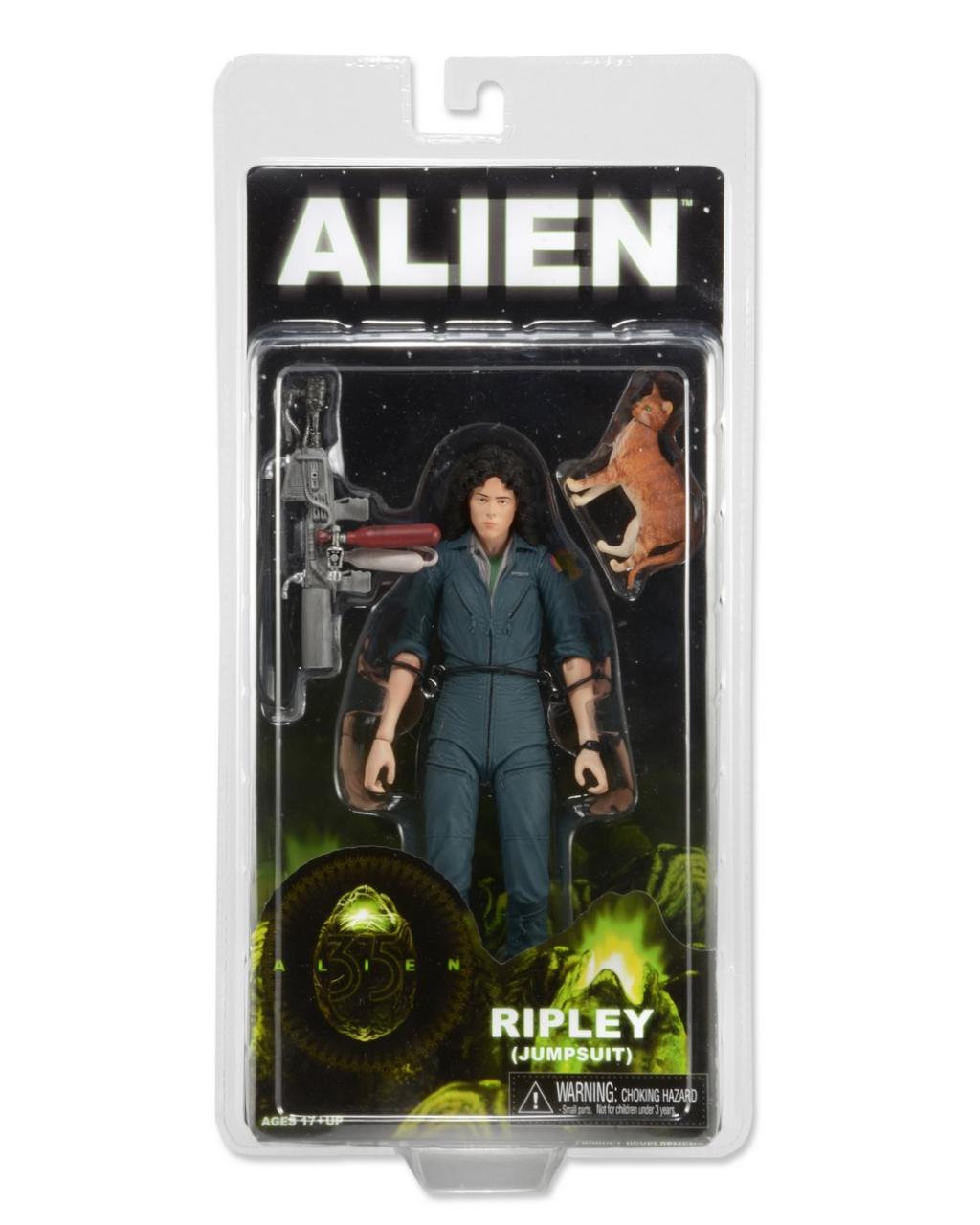 Ripley in Nostromo Jumpsuit comes with flamethrower and Jonesy the cat. Dallas in Nostromo Spacesuit comes with removable helmet, pistol and flashlight. Ripley in Nostromo Spaceuit comes with removable helmet, harpoon gun with two different attachments, and a frightened version of Jonesy the cat. Each fully articulated figure stands approximately 7″ tall and comes in special 35th Anniversary packaging.