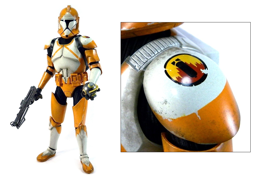 The Bomb Squad Clone Trooper features a color scheme very close to my favorite orange striped "Utapau" Clone Troopers. The orange is a tad darker, but it's fitting considering the fiery nature of the Bomb Squad. Further making this Trooper different is the "Bomb Squad" insignia found on the soldier's shoulder armor, as well as the included display base.