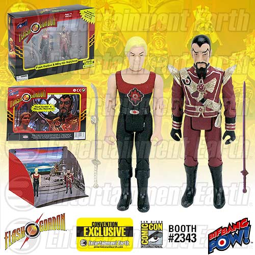 The action figure set includes both Flash Gordon and Emperor Ming, each detailed figure featuring 9 points of articulation and including its own sword accessory. Packaged in a unique full-color box that includes a fold out diorama of Hawk City, this Entertainment Earth convention exclusive gives fans the chance to recreate the memorable Hawk City scene from the 1980 film Flash Gordon. Will Ming emerge victorious or will Flash save the day once again? It's up to you, but not for long. This is a limited edition of only 2,400 pieces priced at $29.99.
