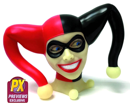 The DC Comics fan-favorite queen of chaos returns to watch your money with this new glow-in-the-dark version of the popular head-sized Harley Quinn bank from Monogram that debuted in the April PREVIEWS. Harley’s life-sized beaming face and headgear measure 11 ˝” tall by 14” wide. This bank will light up the life of any DC fan! The bank can be ordered using code JUL152763 for $29.99 and are scheduled to ship mid-September.