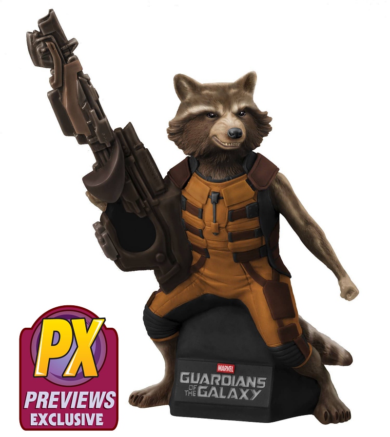 The Rocket Raccoon sculpted bust bank features the loud-mouthed, trigger-happy Rocket standing aggressively while proudly brandishing a large gun. Rocket’s legs are fixed to a black base featuring the movie’s title. As Rocket Raccoon said, “Ain't no thing like me, 'cept me,” and this bank would truly be a unique way for Guardians of the Galaxy fans to look after loose change! The bank can be found in the July PREVIEWS catalog on page and can be purchased using code JUL152827 for $24.99. The bank will ship in mid-August.