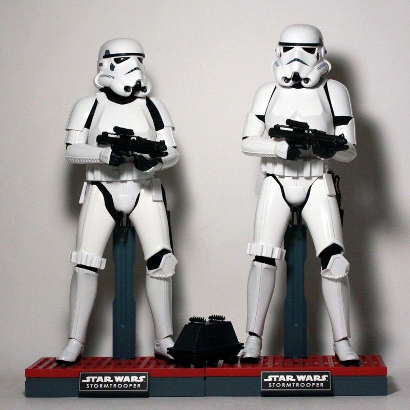 Each Stormtrooper also comes with a blaster rifle, blaster pistol, and a specially designed figure stand with Stormtrooper nameplate and movie logo. The stand holds up the figure at the crotch and has the ability to be tweaked to combine both stands together. All accessories listed so far are available with the standard single release.