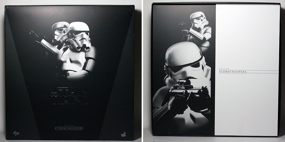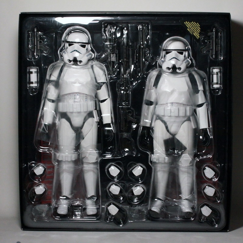 Starting with the packaging: Star Wars releases have all had the same general style guide for all sixth scale releases; a black and dark gray box with some art on the front. The rest of the packaging is very much like all of Hot Toys sixth scale releases, with figures and accessories on the top tray and the display bases and other larger accessories beneath. First glance and you’ll see that one Stormtrooper is taller than the other. Not a real complaint as it adds some variety to the mix but it’s generally a shorter figure wearing the same armor as the taller one.