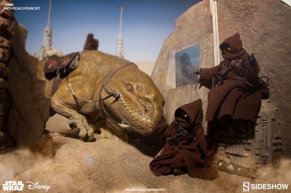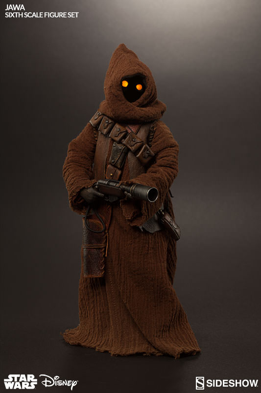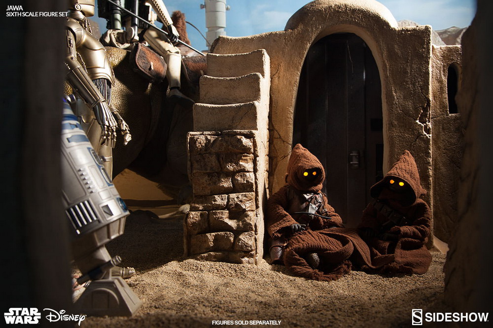 A curious species, bands of greedy merchant Jawas scour the deserts of Tatooine for discarded droids and scrap machinery to repair, trade, and resell. Never seen traveling alone, the Sideshow Collectibles Jawa Sixth Scale Set includes two fully articulated individuals, each packed with personality and the ability to pose in an endless variety of positions for display. The Jawa Sixth Scale Set is available for pre-order now priced at $219.99 and is scheduled to ship between March and May 2016.