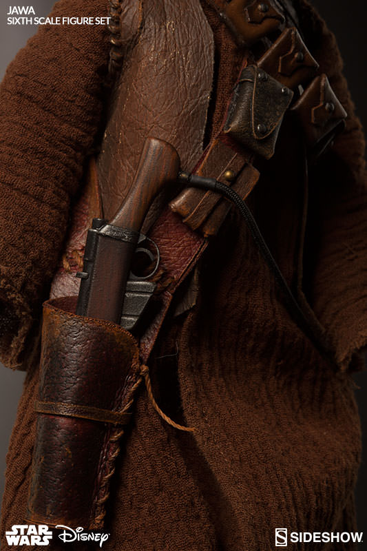 Mysteriously concealed in their traditional brown robes and bandoliers, bright LED-illuminated yellow eyes peer out from beneath the dark folds of their peaked hoods. Ready to peddle their hastily refurbished finds, the Jawas are equipped with an impressive cache of weapons and accessories, including a space thermos, welder, droid caller, magnetic restraining bolt, a blaster pistol which fits neatly in a belt holster, and a droid-stunning Ion Blaster for difficult acquisitions.
