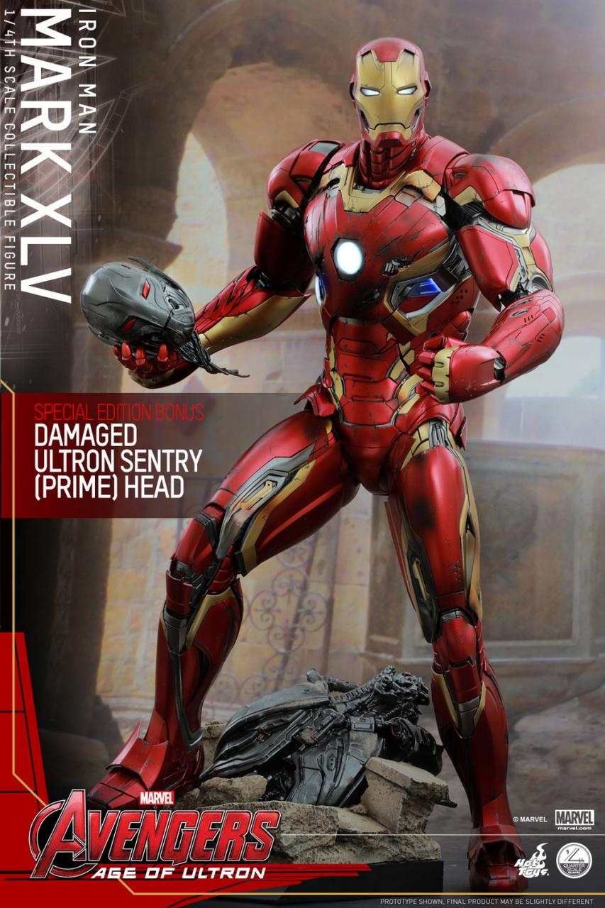 The movie-accurate Mark XLV Collectible Figure is highly detailed and meticulously crafted based on the image of the armor in the film. It features a sophisticatedly sculpted armored body, specially applied metallic red, gold and silver colored paint with weathering effects, great articulations with armor parts linkage designs, LED light-up functions on various parts of armor, and a specially designed diorama base with a Ultron Sentry (Prime) body!