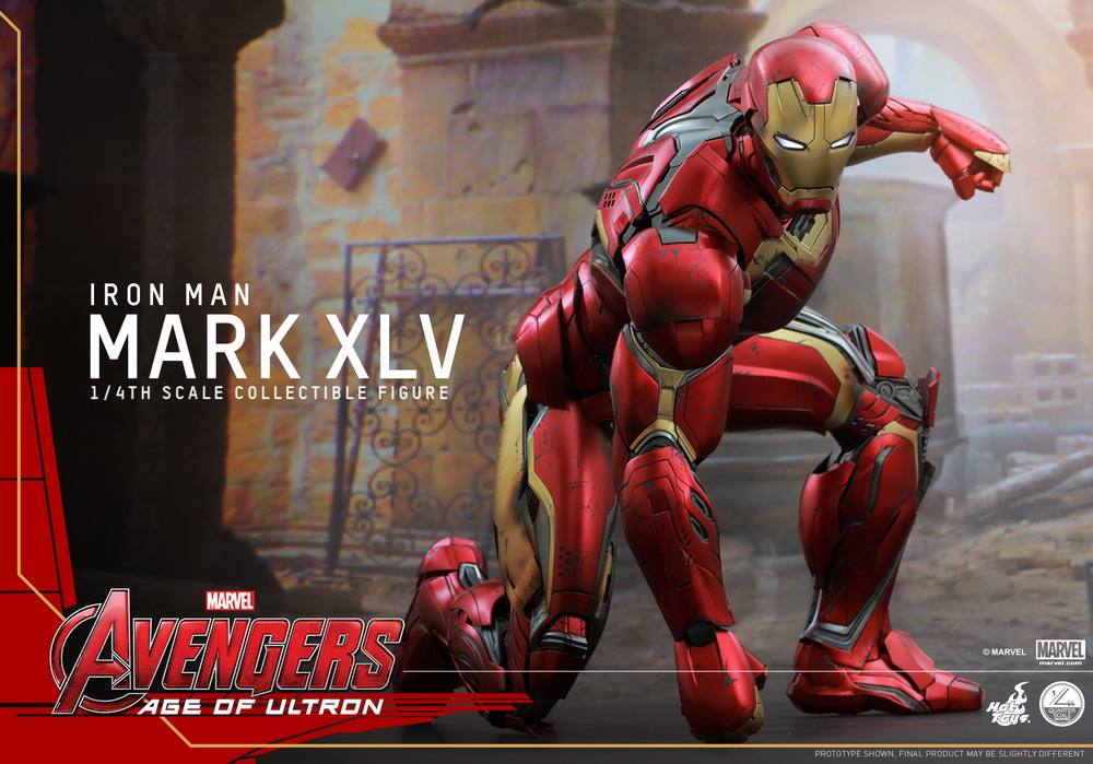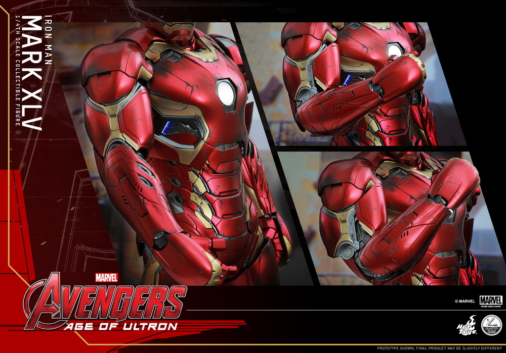 Mark XLV armor for the final battle in Sokovia against the artificial intelligence Ultron. This new suit has captured many fans’ attention with its unique streamline and sleek design. Today, Hot Toys officially presents the Mark XLV Collectible Figure as the latest addition to their Quarter Scale series!