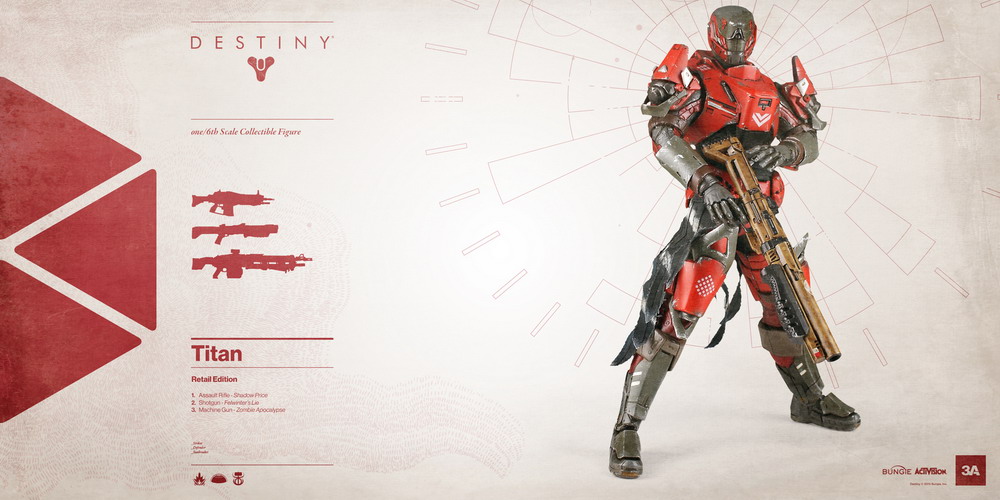 ThreeA Toys announces that they will be releasing a 1:6th scale action figure from the hit video game Destiny. The character class chosen for the first release is the heavily armored Titan complete with a full weapons loadout, including: