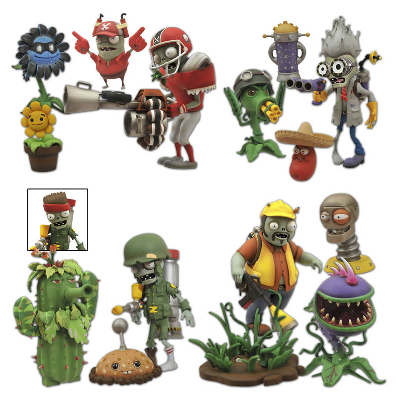 Plants vs. Zombies: Garden Warfare returns with the Select action figure line featuring a 5" scale zombie paired with an enemy Plant along with unique accessories. Each one has an SRP of $24.99 and the series includes Scientist Zombie w/Healing Station & Gatling Pea Shooter w/Chili Bean, Soldier Zombie w/Commando Head & Ghillie Cactus w/Potato Mine, Engineer Zombie w/Turret & Chomper w/Spike Weed, and All-Star Zombie w/Imp Bomb & Dark Sunflower w/Marigold.