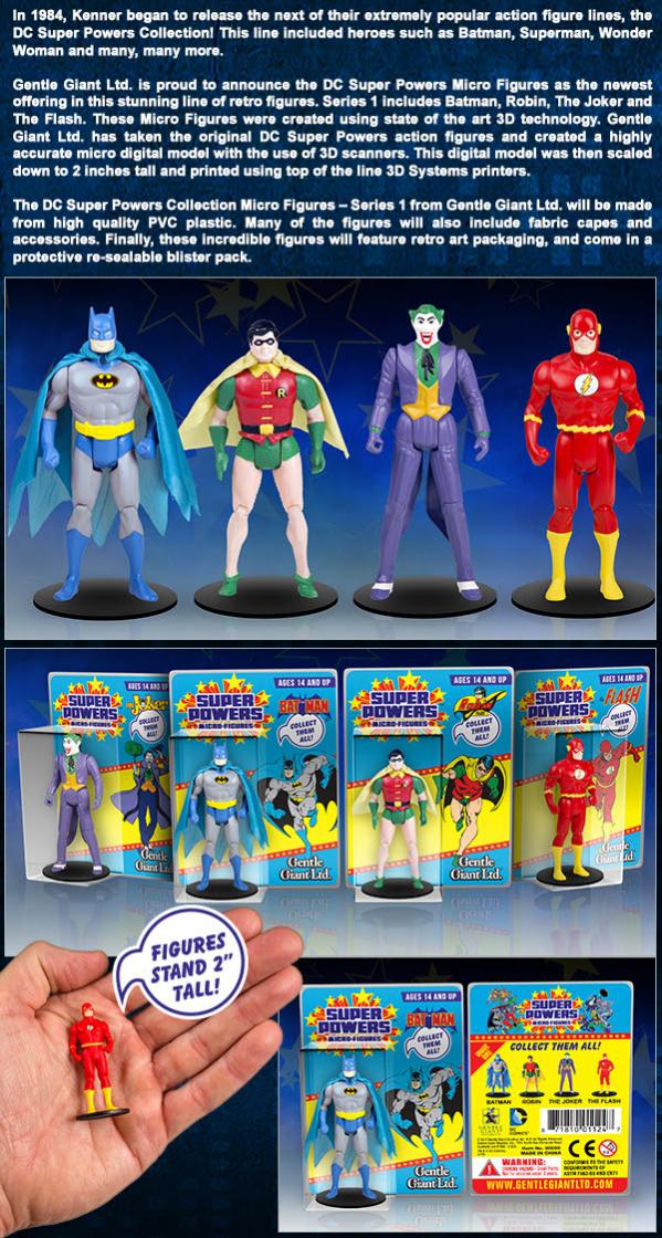 It's a big week for collectors as Gentle Giant Ltd. announced a slew of new products now available for pre-order and coming later in 2016. The collectibles cover many of today's hottest franchises including Star Wars, the Walking Dead, and both Marvel AND DC Comics. While Gentle Giant is probably best known for its big statues, the company is making waves with new small-scale comic book figures. New for the DC Comics license is the Super Powers Micro-Figures line! Wave One ($3.50) is slated for Q3 2016 and brings Batman, Robin, Joker, and Flash in new mini-figures that recreate the look and feel of the classic 1984 Kenner line. They're sourced from scans of the original figures and scaled down to 2 inches tall and come with fabric capes (where applicable) though no articulation. Even the packaging is inspired by the Super Powers cards we all knew and loved.