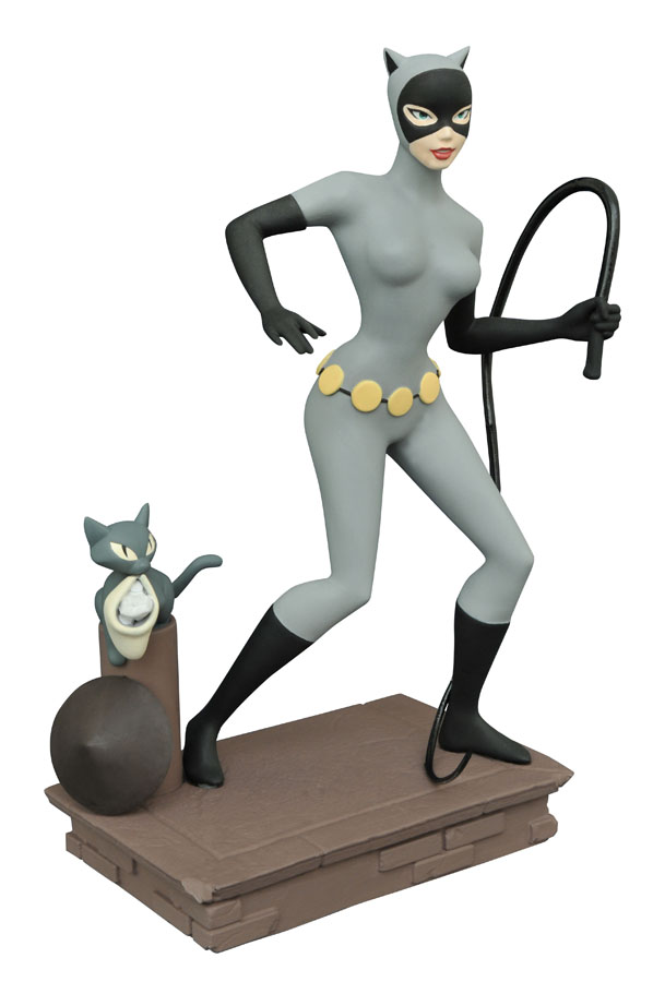 This cat has nine lives! Robbing the rich and running around on rooftops gets Selina Kyle’s engine racing, and now DST has captured her in the act with this 9-inch scale PVC statue! Standing atop a rooftop base with her feline friend, this PVC statue of Catwoman as she appeared in Batman: The Animated Series comes packaged in a full-color window box, and will fit in with the rest of your DC Animated Femme Fatales statues. Sculpted by Varner Studios! (Item #SEP152162, SRP: $44.99)