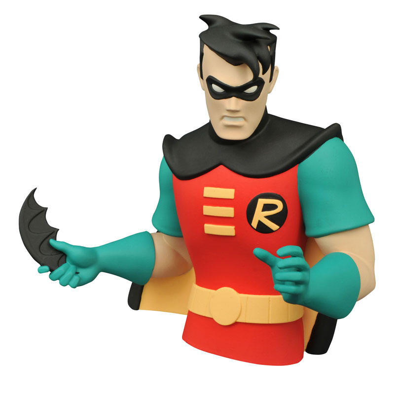 Even Batman needs a wingman sometimes! There’s nothing more annoying than fighting crime with a pocketful of loose change, so why not give it to your sidekick to hold? This vinyl bust bank of Robin is based on his appearance in Batman: The Animated Series, and features cartoon-accurate details, as well as a coin slot in the back and an access door in the base. Once secured inside the Boy Wonder, your money will be as safe as your secret identity! Packaged in a clear polybag. Batman bank coming soon! Sculpted by Varner Studios! (Item #SEP152163, SRP: $22.99)