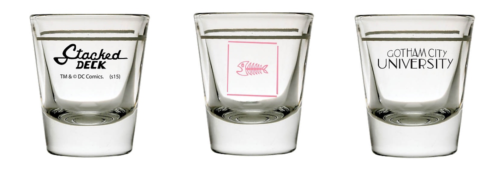 In Gotham City, there’s good shots and bad shots. Enjoy the good kind of shot in one of three different shot glasses inspired by famous Gotham City locations! From the TV show Gotham, belly up to the bar at Mooney’s, the bar with the fish logo, inspired by owner Fish Mooney. From Batman: The Animated Series, visit The Stacked Deck, where super-villains go to exchange stories about how they “Almost Got ‘Im.” Then go and earn a degree in mixology from Gotham City University, where the students study hard and party harder. Each shot glass comes packaged in a full-color window box.