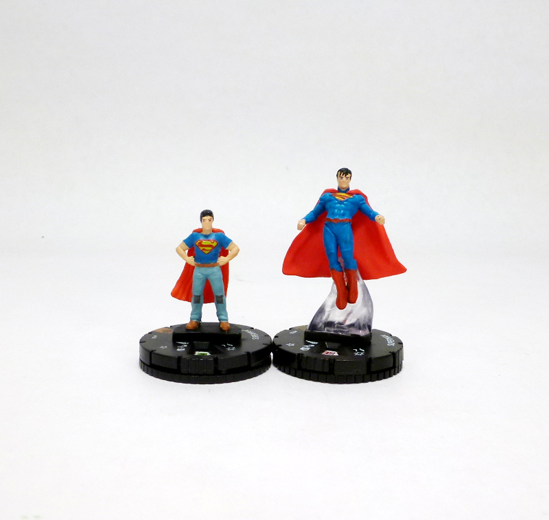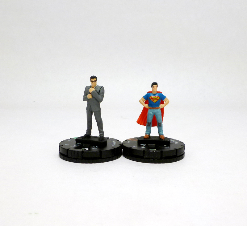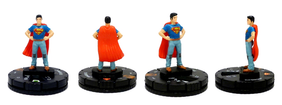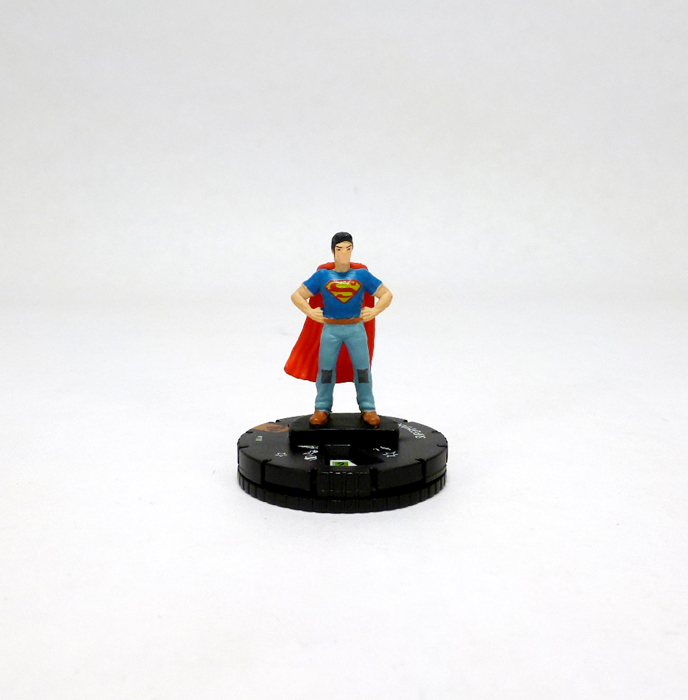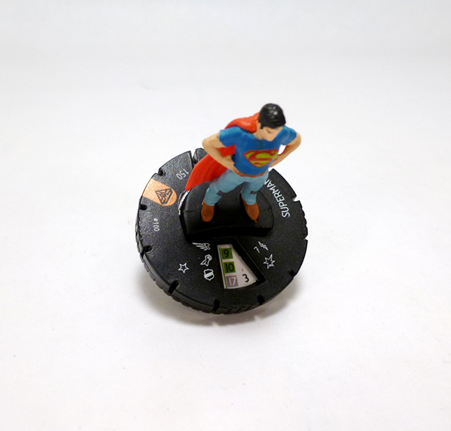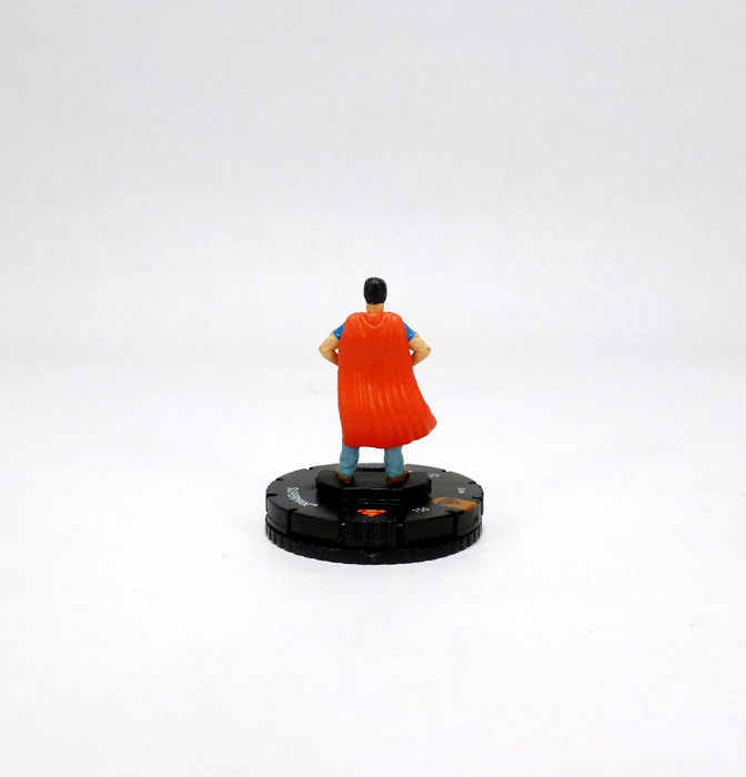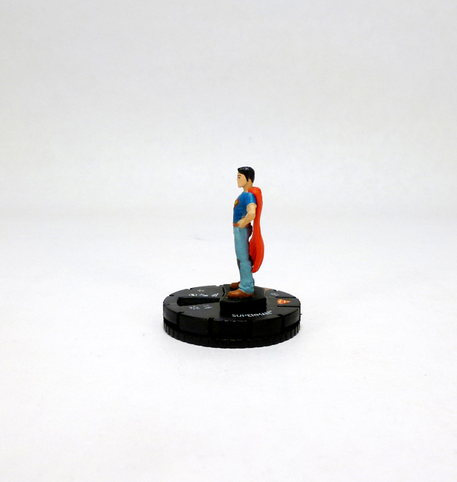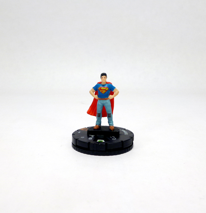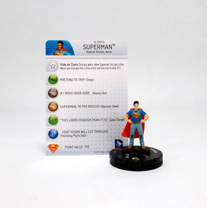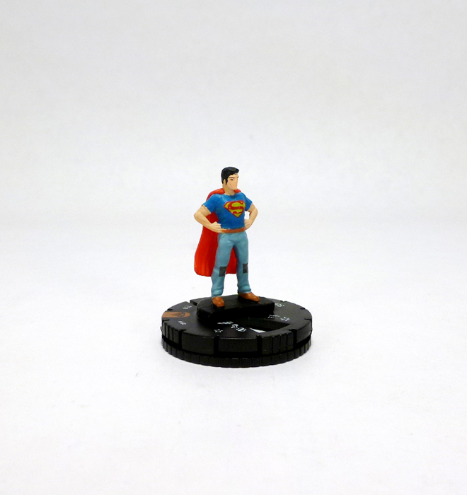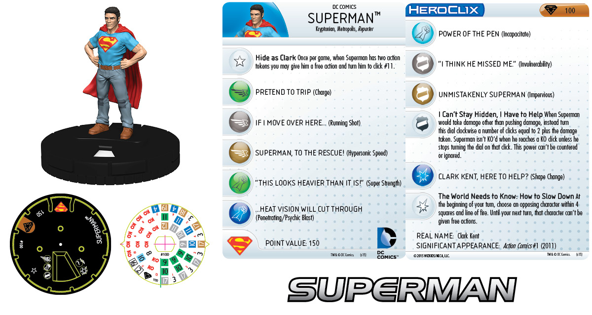 With a whole slew of Superman figures in this new set WizKids has lots of opportunities to give the players unique takes on the Man of Steel, and this one is a great example of that. The young Superman is 150 points (great for team building at half of your team in a standard game) with the Superman Ally team ability, flight, Indomitable, a good 7 range with one target, and a powerhouse trait called “Hide as Clark.” Capturing the character at the start of his heroic career the figure starts out moderately strong and only gets more powerful as his dial progresses. He starts with average numbers and a standard close combat assortment of powers: Charge, Super Strength, and Invulnerability. Superman’s stats remain frozen until click #5, one notch past his shift to ranged combat with Running Shot, Penetrating/Psychic Blast, and Impervious! The end of his dial sees all of his numbers spike until on his last regular click (#7) he’s rocking a 12 movement Hypersonic Speed, 11 attack with Super Strength, 19 defense Impervious, and 4 damage with Shape Change. Now let’s look at that trait. “Hide as Clark” says that once per game when Superman has two tokens you can give him a free action to turn him to click #11. There he has middling stats (as his alter ego) with Incapacitate and two special powers; one lets you prevent a nearby enemy from using free actions and another that spins Superman back onto his regular dial when he takes damage! Done at the right time, “Hide” can extend this figure’s life and get him back in the game like crazy. Superman has to work a little harder for theme teams at the beginning of his career with only the keywords Kryptonian, Metropolis, and Reporter.