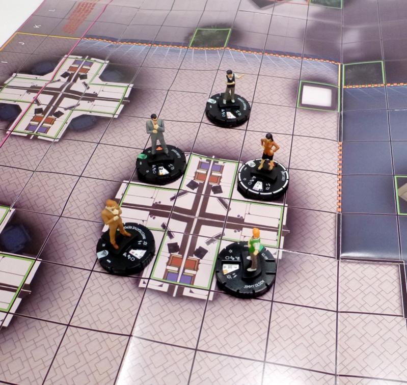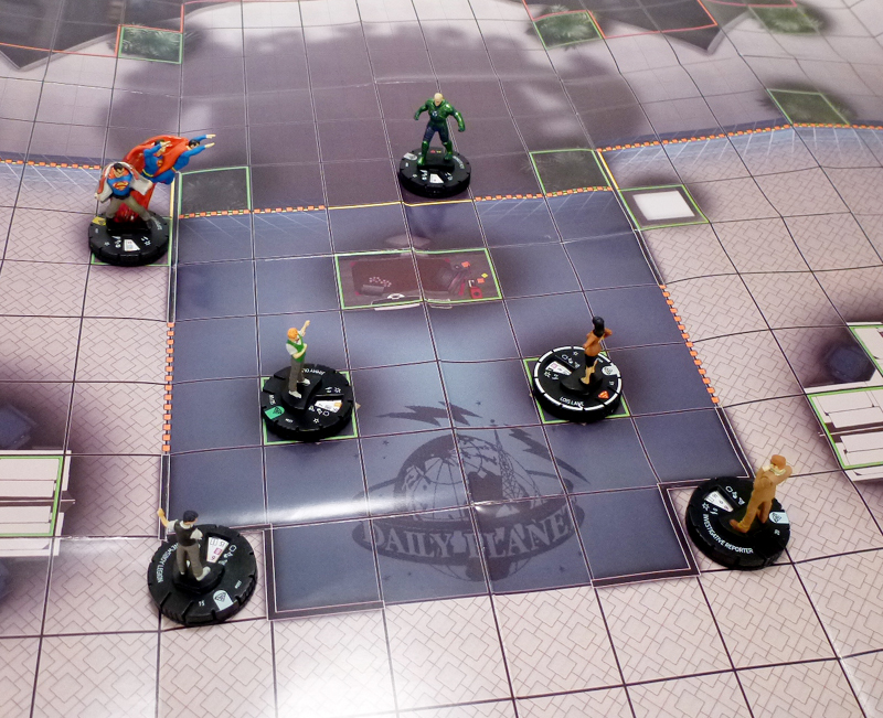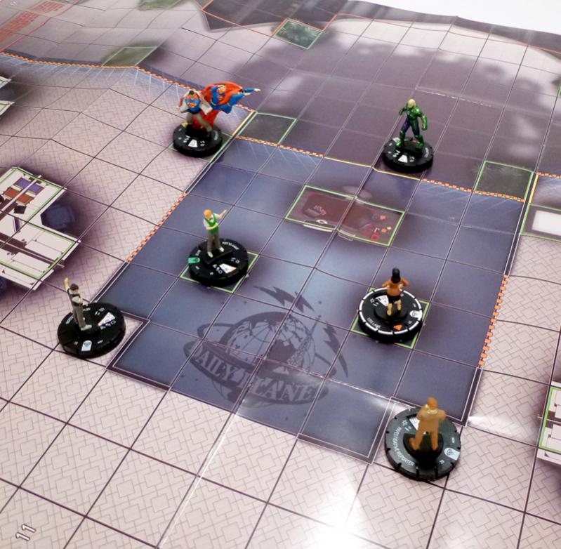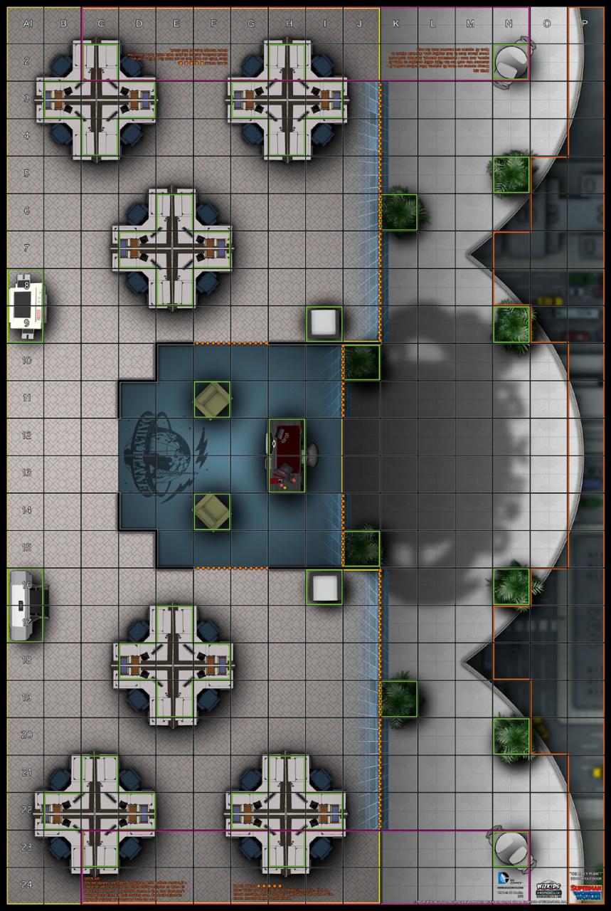 The other side of the map brings the fight to Metropolis and the Daily Planet building! The indoor/outdoor map depicts an upper floor of the building with about two-thirds of the map inside the newspaper offices and the rest outside on the balcony and open air. The symmetrical office space has large pods of desks and copiers/fax machines for lots of hindering terrain, and in the center is a large office with desk and chairs. Outside there’s more hindering terrain from plants, and the map is interesting for having no blocking, elevated, or water terrain. There are two different types of special features on the Daily Planet map. The first consists of “Open Air” squares running down the long edge of the map that’s outside; this type of terrain that we’ve seen on previous maps drops characters who can’t fly, damaging them and returning them to their starting areas. There are also “Glass Walls” around the central office and the borders between the indoor and outdoor areas; they are walls that don’t block line of fire and are destroyed when attacks pass through them.