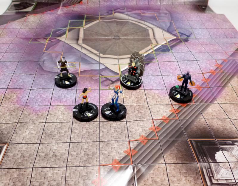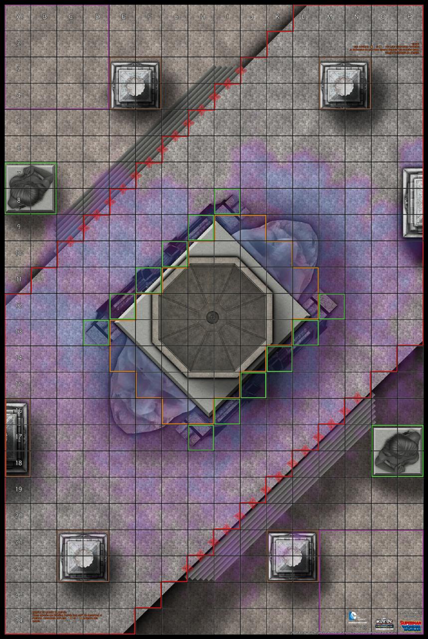 In addition to the Superman figure the Release Day kit includes a new double-sided map so you can play all of the cool figures in the set on thematic battlegrounds! On one side is the mythological Mount Olympus, an outdoor map that features some fairly standard elements like lower elevations in the starting areas and a large central blocking terrain feature. However, Olympus mixes it up with a diagonal theme including starting areas in opposite corners! Statuary provides some hindering and blocking terrain, and the center of the map is comprised of special “Temple of Mount Olympus” orange squares that are blocking which can’t be destroyed or replaced, even by characters with Improved Movement or Targeting that destroys that type of terrain.