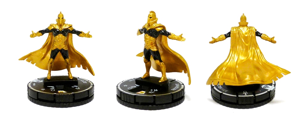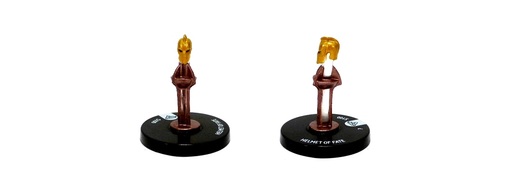 In addition to the six figures the Wonders of the World Fast Forces pack comes with a new special object that DC fans have been waiting for, the Helmet of Fate! Also known as the Helm of Nabu, this mystical headwear links its wearer to that Lord of Order and acts as a conduit for his power and influence. While it grants the user fantastic power it also makes him or her a vessel for Nabu’s possession in varying degrees. In HeroClix the Helmet is a very nicely crafted little piece, with the object of mystery atop a small pillar. There’s translucent plastic in the middle of the stand and below the helmet to make it look like it’s floating, and bright gold and a burnished bronze on the two sections look great. The object costs 7 points and can be equipped via a power action by a character (put on its card) to provide the use of Incapacitate, Mind Control, and Penetrating/Psychic Blast. However, any time the character uses one of these powers and hits it gets a Host token and you must roll a d6 and subtract the number of Host tokens. If the result is too low the Helmet is removed from your character and placed in the square of a hit target! Note that the Doctor Fate in this pack has a trait that lets him start the game with this object equipped for free, AND he removes a Host token when he clears so he’s more likely to keep it longer.