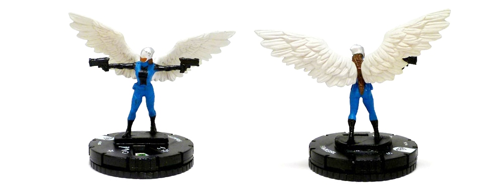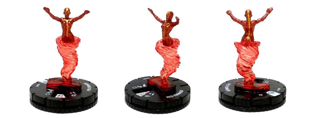 WizKids definitely had a challenge in translating Val-Zod into a game piece what with his huge potential tempered by his captivity and philosophy. The main set Superman II is 150 points who gets more aggressive down his dial while the Fast Forces version is 120 points with a “Bizarro” style dial that sees every stat increasing as he takes damage and on top of that he has a trait giving him enhanced abilities as he takes damage; starting on click #3 he has Flight and from #7 on he has Indomitable! Fast Forces Red Tornado is 25 points more affordable at 70 points trading Indomitable, Sidestep, and Telekinesis for a full dial of Force Blast and Smoke Cloud (with special effects), some amped up Super Senses, Shape Change, and a final pair of clicks that are solid purple (like previous Red Tornado figures). The new Hawkgirl is the greatest steal at only 45 points with Flight, traited Sidestep that takes her 3 squares if she has no tokens, Charge, Flurry, and layered defenses.