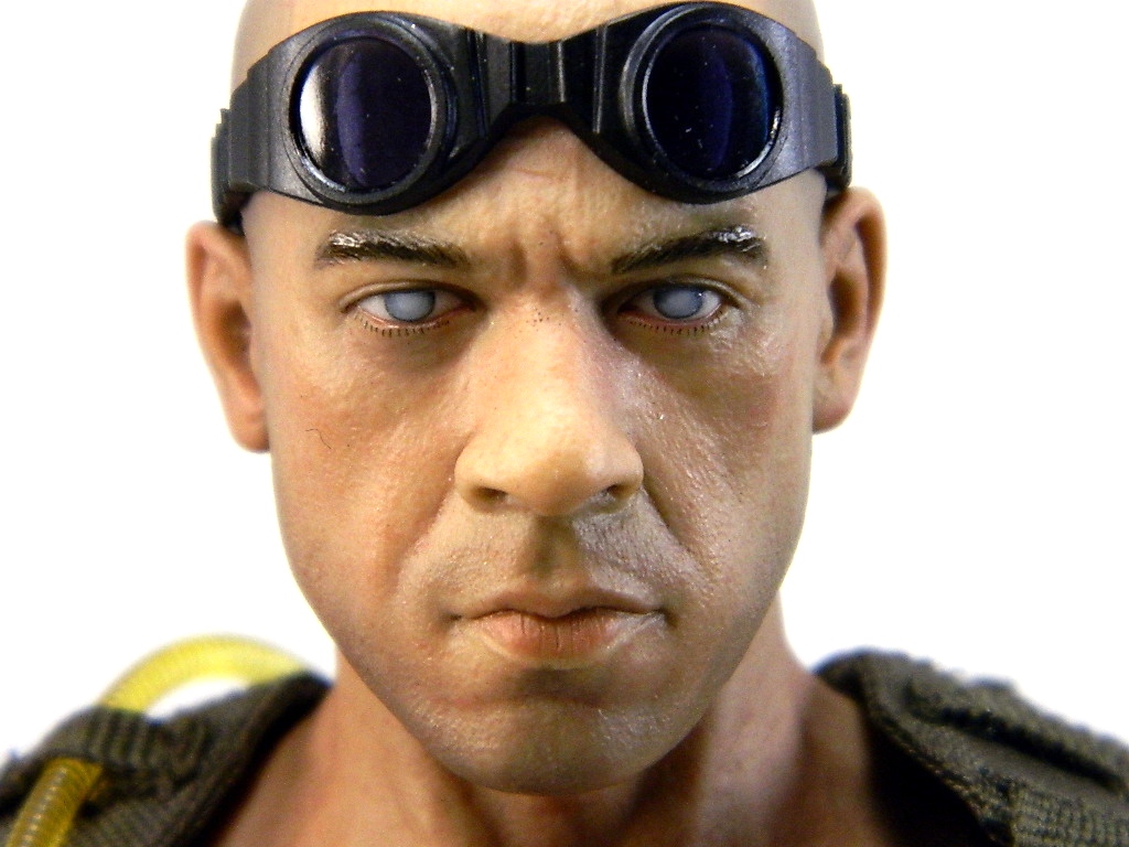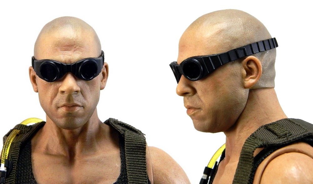 Anyways, this figure, while simple as far as its outfit and accessories, absolutely amazes with the thing that counts the most: a dead-accurate Vin Diesel head sculpt. The entire figure hinges on Art Figures getting this right, and they exceed all expectations down to Riddick's eerie pale see-in-the-dark eyes. The accessories, while light, are all you need for a Riddick figure. He comes with his iconic curved saber blades, each super pointy and cast in hefty die-cast metal, along with a bonus bladed weapon, also metal. His final weapon is a Necromonger dagger, this ornately detailed weapon cast in plastic and including a sheath that attaches to Riddick's ankle. He also comes with his trademark black goggles cast in a hard rubber-like plastic. These fit extremely snug and tight - a good thing - but be extra carefully sliding them on. While durable, I can see them snapping if pulled off and on enough times with force. Riddick also includes a pair of fisted hands, a pair of gripping hands (nice solid grip on the saber blades), and a pair of bendy finger hands. Lastly, the figure features a pair of shackles and Riddick's survival harness. The plastic cuffs, while nice looking, I don't see many people using for display. The latter simply slides onto the figure and snaps shut in the front. This rig features a drinking system and two slots on the back to place Riddick's saber claws.