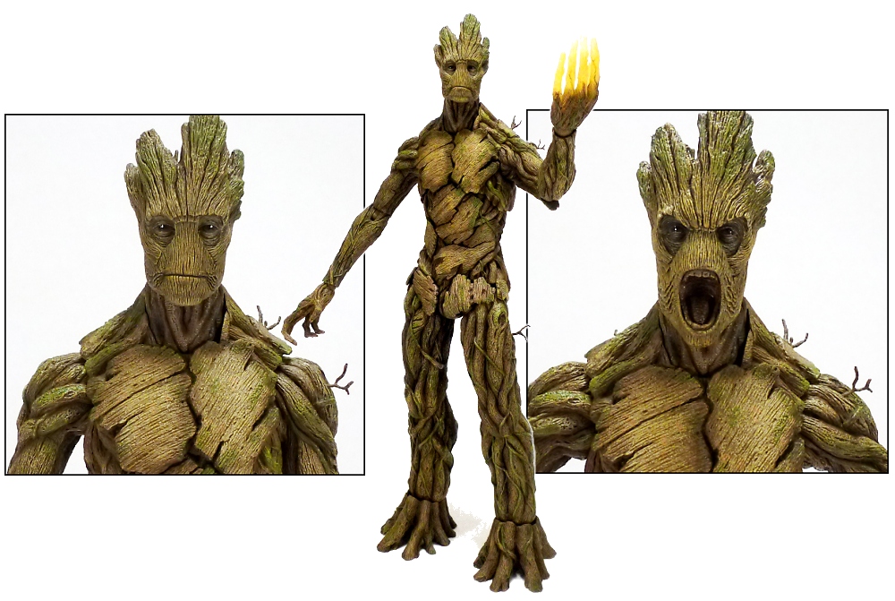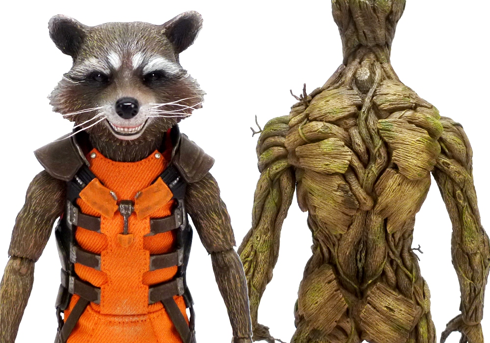 So what do a tiny raccoon creature and a gargantuan tree person look like in 1/6th scale? Rocket stands an impressive almost 6 ½ inches tall while Groot towers over him at just under 15 ½ inches! You can work out the math yourselves on whether or not that’s accurate to the film’s CG models, but it looks right on and they fit very well together. And while Rocket has realistic whiskers and wears a cute little outfit Groot features an amazing full-body tree-like texturing. They’re both fully articulated and have additional parts equal to and in addition to what you’ll find in the individual figure releases. Let’s take a closer look.
