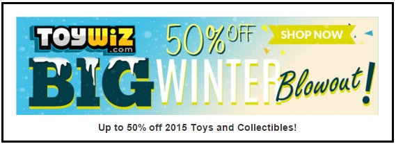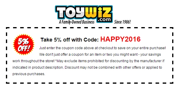 ToyWiz.com has thousands of in-stock items. Use the coupon code HAPPY2016 and receive 5% off your purchase! Also take advantage of ToyWiz's Big Winter Blowout Sale: Up to 50% off 2015 Toys and Collectibles!