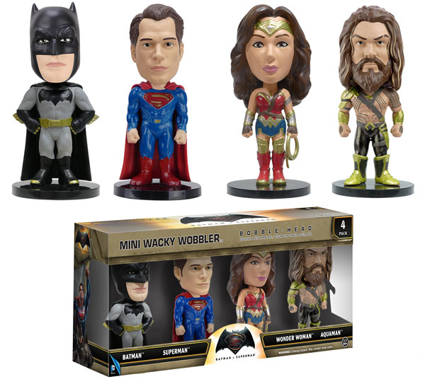 We're still a few months away from Batman v Superman: Dawn of Justice, but that hasn't stopped the collectible floodgates from opening now. In addition to action figures from Mattel, Batman v Superman product from Funko is now hitting retail in a wide variety of fun Funko formats. Superman, Batman, Wonder Woman and Aquaman will be featured as Pop! vinyl figures, Pop! Pen Toppers, Dorbz, Wacky Wobblers (standard and mini), Vinyl Idolz, and Mystery Minis. Dorbz Ridez will also make their brand debut with a Batman and Batmobile set.