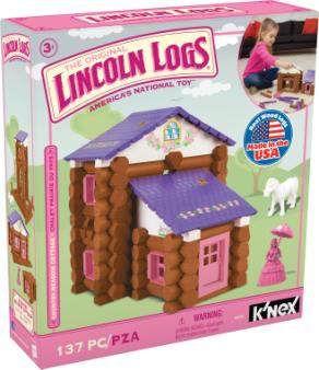 A Lincoln Logs building set designed especially for girls! The Country Meadow Cottage includes 137 made in the USA real wood logs, plus colorful figures and play accessories. Your little girl will have endless hours of fun building the cottage, decorating it with the included stickers and playing with the Cowgirl figure and pony! Suggested retail price is $34.99.