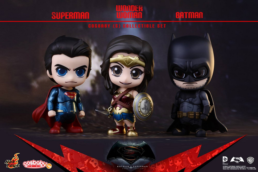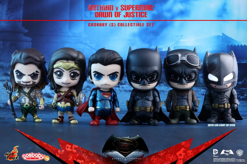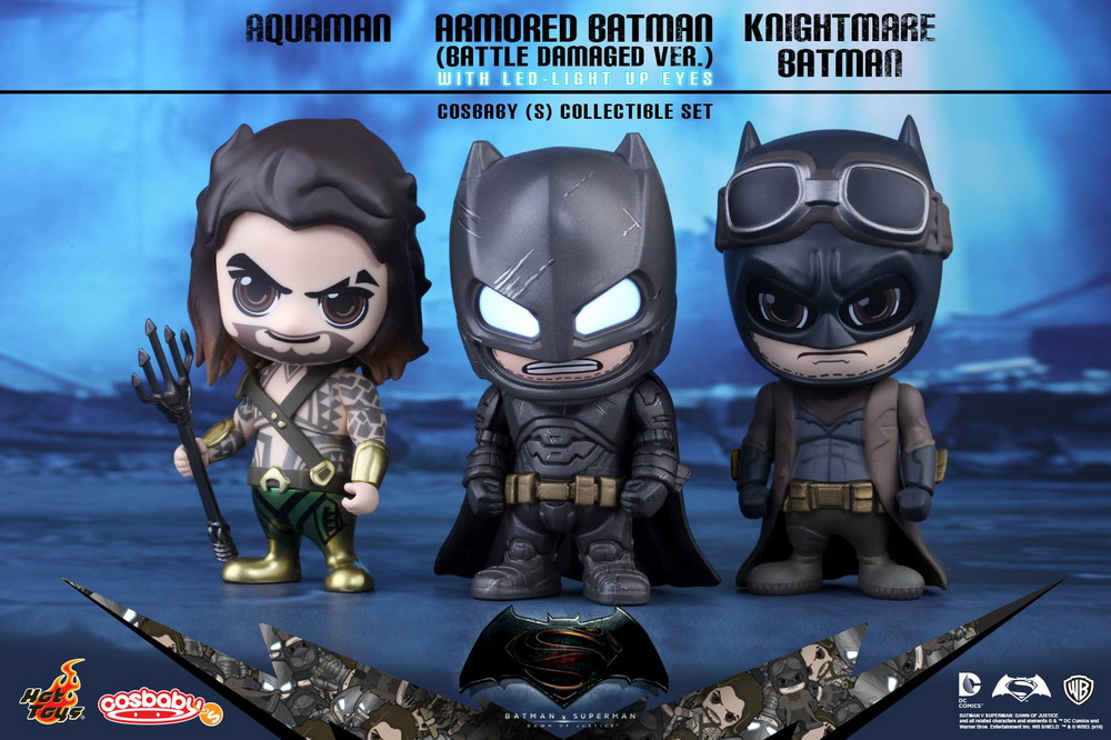Hot Toys presents a cute new series of Cosbaby (S) figures based on the upcoming motion picture, Batman v Superman: Dawn of Justice. This new series features 6 characters from the film, including Superman, Wonder Woman, Batman, Armored Batman (Battle Damaged Version), Knightmare Batman, and Aquaman.