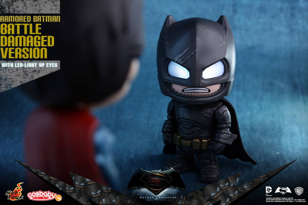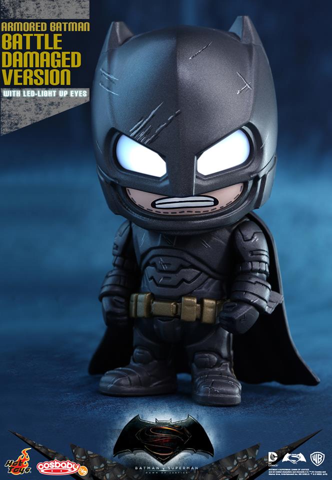 Each Cosbaby stands approximately 3.7-inches tall (9.5cm) and features a head that turns. The Armored Batman (Battle Damaged Version) will also include LED light-up eyes!