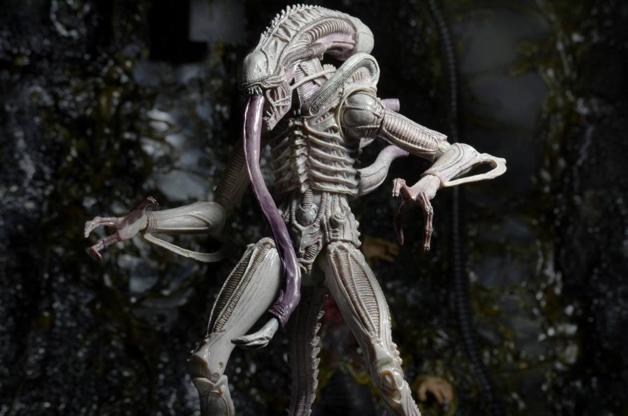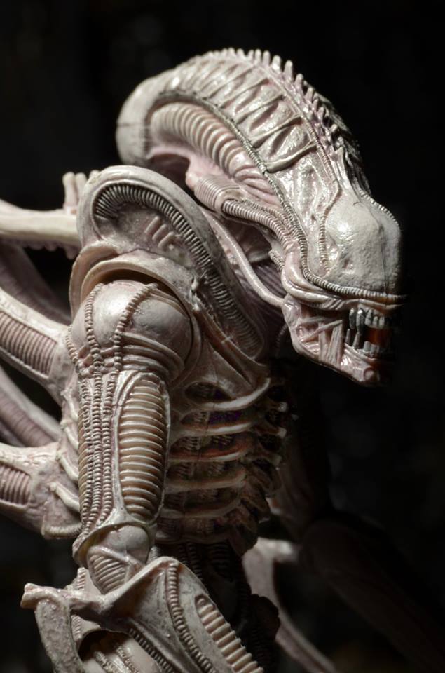 The Albino Alien is NECA's first concept figure from the 1986 movie. It was inspired by the original James Cameron screenplay, which describes an albino version of the Xenomorph that has an excreting probe in place of the usual second inner mouth. The Albino Alien has over 30 points of articulation and features a bendable mouth probe and a frightening new color scheme.