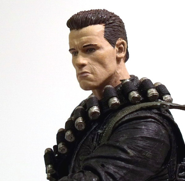 The headsculpt for this figure is undeniably Arnold Schwarzenegger, especially in profile. It's certainly the best Arnold we've gotten in action figure form on this scale. What's extra nice about it is the ball-joint NECA used for neck articulation. The articulation point, used in the Final Battle T-800 and first two Series 1 figures as well, allows for a wide range of movement: Tilted sternly down, cocked to the side or peering straight up. Having ball-jointed heads on these figures also allows you to swap out Arnold heads. Want that super battle-damaged head on the Cyberdyne Arnie? No problemo.