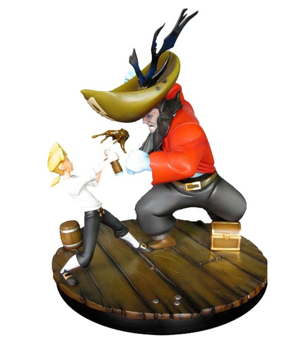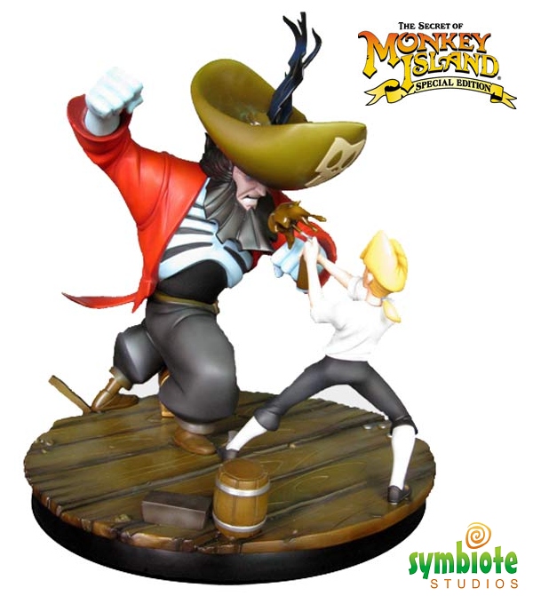 The 10" tall statue is based off the classic Monkey Island video game series and is brought to you with 3D flare thanks to the art of the Monkey Island Special Edition. The piece depicts the epic battle between Guybrush Threepwood and the Pirate LeChuck. The statue art was created by Dela Longfish and the package was designed by Curt Rapala.