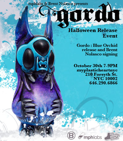 Join us on Halloween eve October 30th from 7-9PM for the release of the Gordo : Blue Orchid Edition. Creator Brent Nolasco will be on hand to sign, sketch and chat all evening. A limited number of Gordos will be available at the release event with the remaining figures made available online at myplasticheart.com on 11/02 at 1PM EST.
