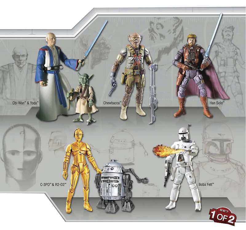 * Set 1 (pictured above) includes McQuarrie’s versions of Han Solo (who bears more than a passing resemblance to a young George Lucas), Chewbacca, Obi Wan Kenobi & Yoda, C-3PO & R2-D2, and Boba Fett.