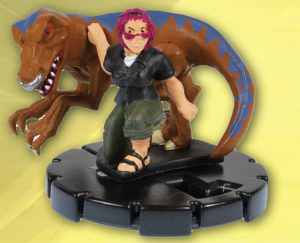 One of the most famous members of the Runaways, Gertrude is in the enviable position of owning her own pet dinosaur, a Deinonychus named Old Lace. Together they are Arsenic and Old Lace, and fight alongside the other children of the villainous Pride. The pair are one of only two duo figures in Hammer of Thor (both Super Rares), and capture the girl and dinosaur duo ready to attack. The fearsome Old Lace looks forward with baleful red eyes and wicked claws outstretched, while Gertrude kneels beside it, about to give the order for battle!