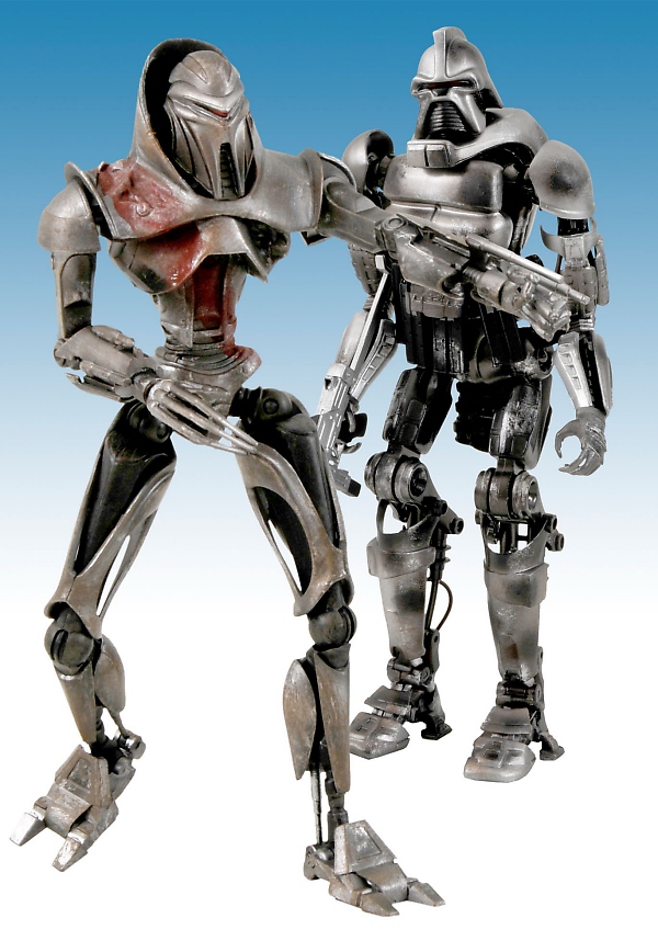 Diamond Select Toys reveals a new Battlestar Galactica action figure 2-pack based on the series finale "Daybreak". Hitting comic shops and specialty stores early next year, this set includes a modern "red stripe" Cylon and an old school retro Cylon. Both come battle damaged as seen in the explosive episode.