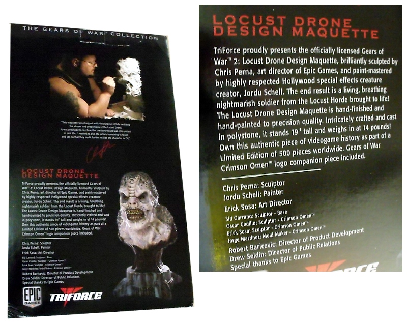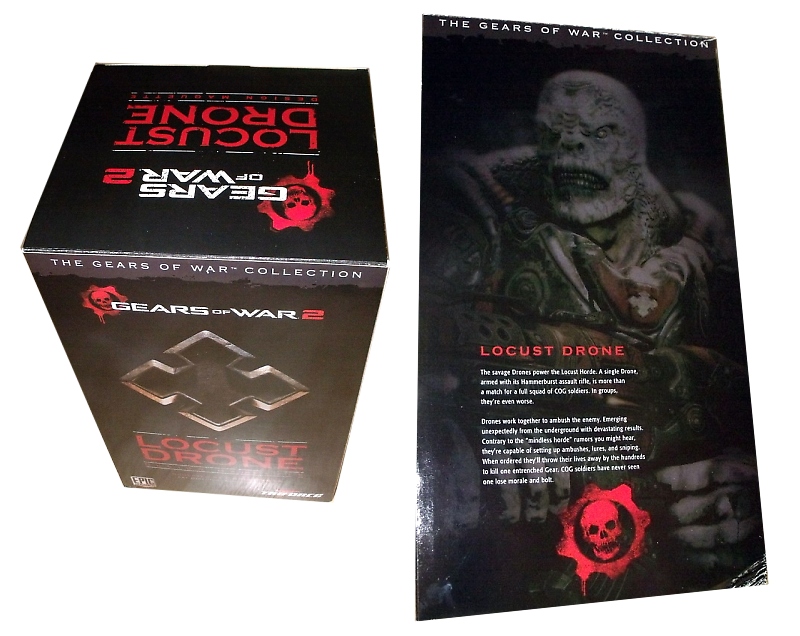 PACKGING: The packaging for the Maquette may seem lackluster at first, but it’s the subtlety of it that really catches the eye. A fully black, rectangular box measuring 22" x 13" x 12" encases the menace. The front of the box bears the Locust Sigil, an Iron Cross design as well as the Gears of War 2 logo. Below the Sigil, the box sports the name of the piece as well as its sculptor’s name, Chris Perna. Each side of the box has a black on black watermark style picture of a Drone; taken straight from the game. One side gives a bio on our cave dwelling friend while the other just takes a full black approach.